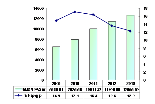 初步核算,全年实现地区生产总值12656.69亿元,比上年增长12.3%。其中,第一产业增加值1002.68亿元,增长4.7%;第二产业增加值6397.92亿元,增长13.4%;第三产业增加值5256.09亿元,增长12.0%。三次产业结构比为7.9:50.5:41.6。非公有制经济实现增加值7782.56亿元,增长12.4%,占全市经济的61.5%。