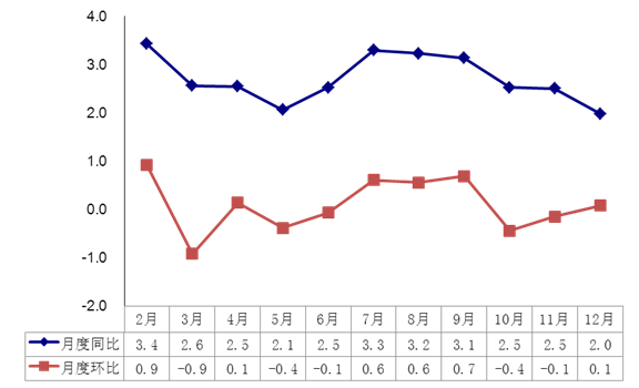 城市居民消费价格比上年上涨2.7%,其中食品价格上涨4.1%。工业生产者出厂价格比上年下降2.0%。工业生产者购进价格比上年下降2.4%。固定资产投资价格比上年上涨0.5%。农产品生产者价格比上年上涨3.0%。