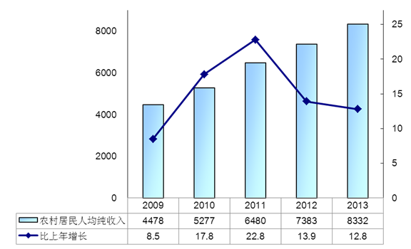 图9 2009-2013年农村居民人均纯收入及增长速度