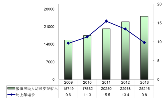 图8 2009-2013年城镇居民人均可支配收入及增长速度