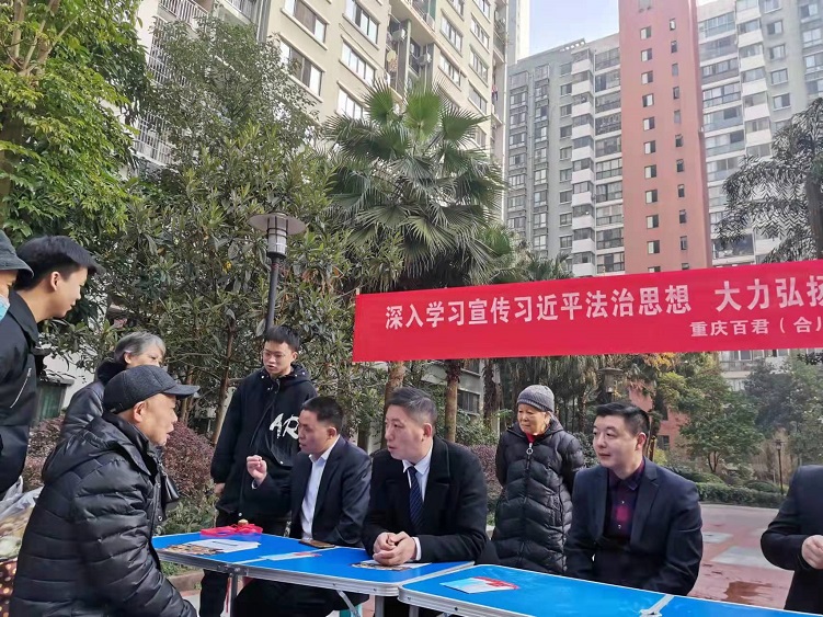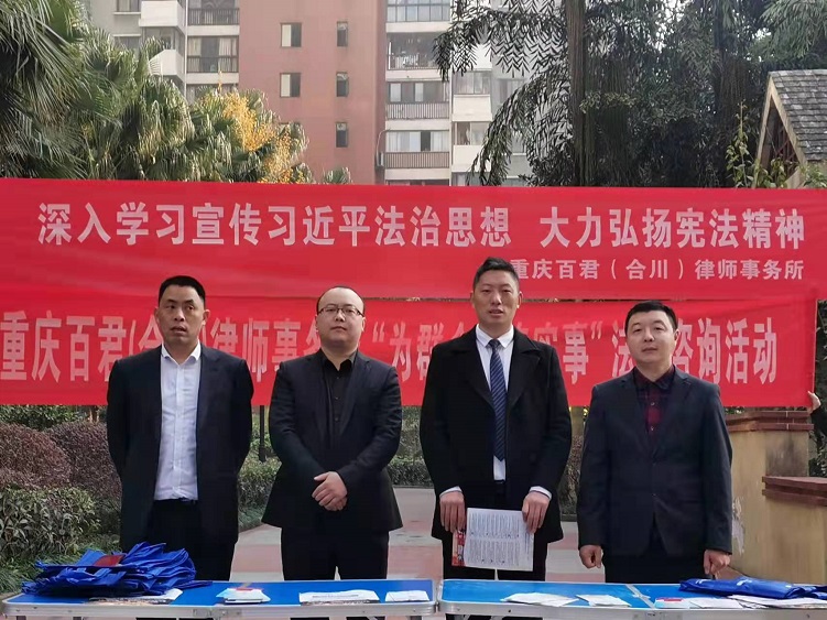 为进一步深入宣传贯彻习近平法治思想,弘扬宪法精神,2021年12月3日上午,重庆百君(合川)律师事务所组织律师开展法治宣传,本次宣讲活动由合伙人龙朝斌律师牵头,带领本所执业律师、实习生等10余人来到合川区钓鱼城街道东海滨江城一期开展法治宣传活动。
